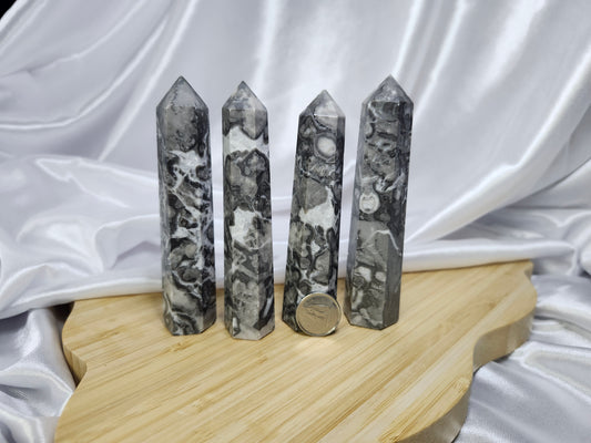 Crystal towers are elongated, pointed pieces of crystals that are cut and polished into a tower or obelisk shape. These structures are designed to direct and amplify energy through their apex, making them popular in meditation, healing practices, and as focal points in home décor. The form of a tower is believed to enhance the crystal's natural properties by channeling energy in a focused manner. Crystals are naturally and beautifully unique. Therefore, the photo(s) shown is an example(s). By purchasing 1 quantity of this item, you will receive 1 of the pictured product(s). Product size, appearance, and color may vary from the examples shown.