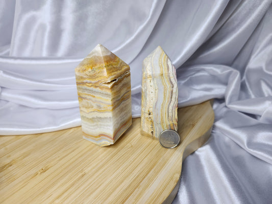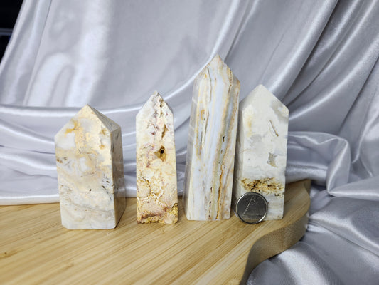 Crystal towers are elongated, pointed pieces of crystals that are cut and polished into a tower or obelisk shape. These structures are designed to direct and amplify energy through their apex, making them popular in meditation, healing practices, and as focal points in home décor. The form of a tower is believed to enhance the crystal's natural properties by channeling energy in a focused manner. Crystals are naturally and beautifully unique. Therefore, the photo(s) shown is an example(s). By purchasing 1 quantity of this item, you will receive 1 of the pictured product(s). Product size, appearance, and color may vary from the examples shown.