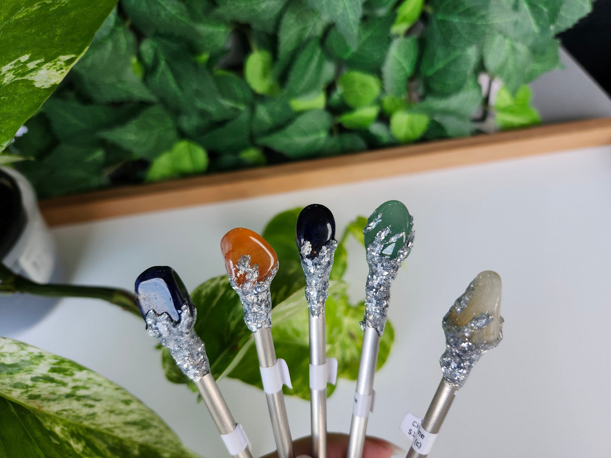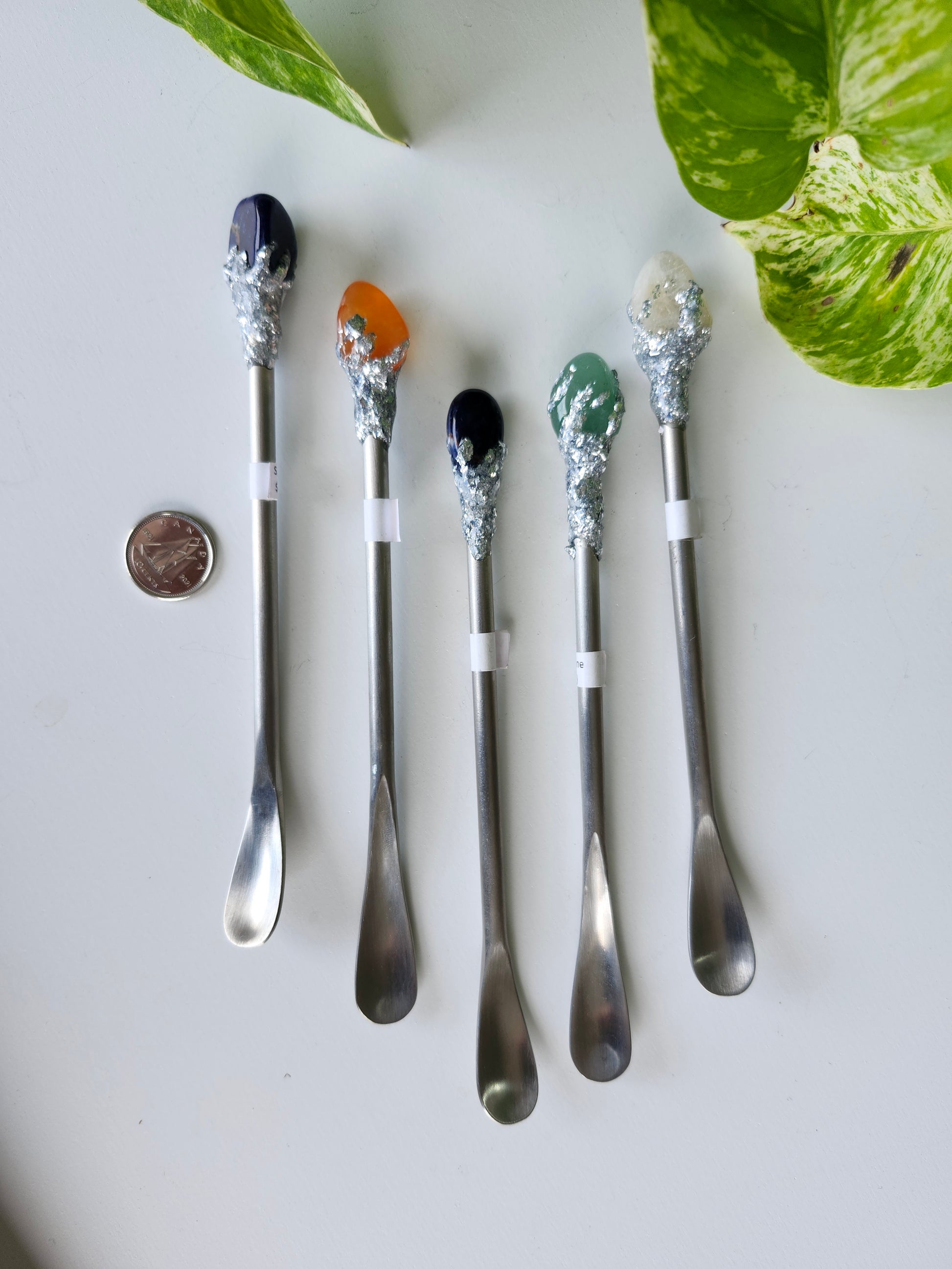 "Mystery mini spoon featuring a unique crystal handle. Each spoon is one of a kind, and by purchasing, you will receive a product similar to the one pictured. Size, color, and appearance may vary due to the natural uniqueness of the crystals."