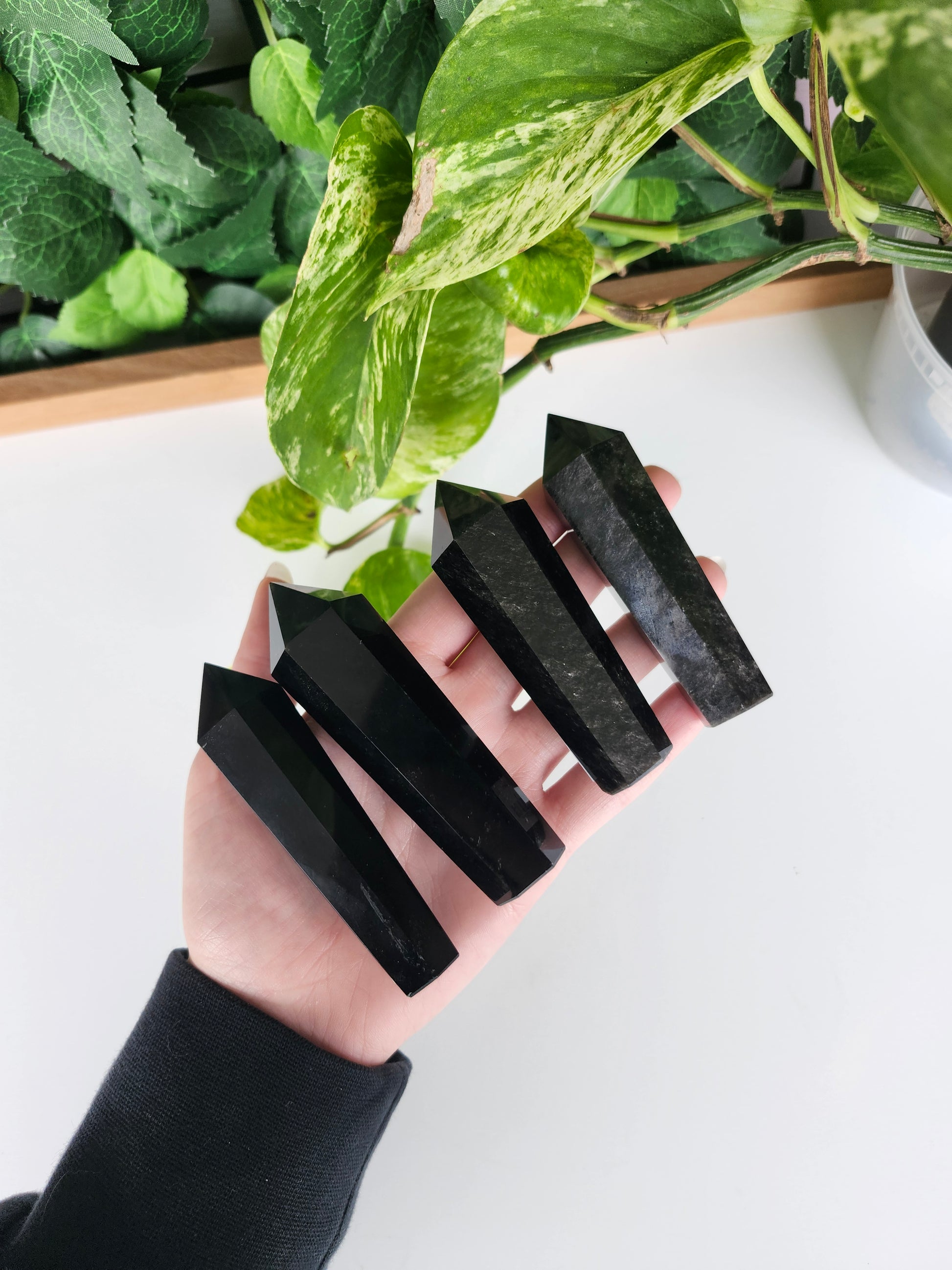 Powerful Obsidian tower with a sleek black sheen, typically sourced from volcanic regions like Mexico. Obsidian is a protective stone, known for its ability to shield against negativity, clear emotional blockages, and promote grounding. It's often used for deep emotional healing and protection.