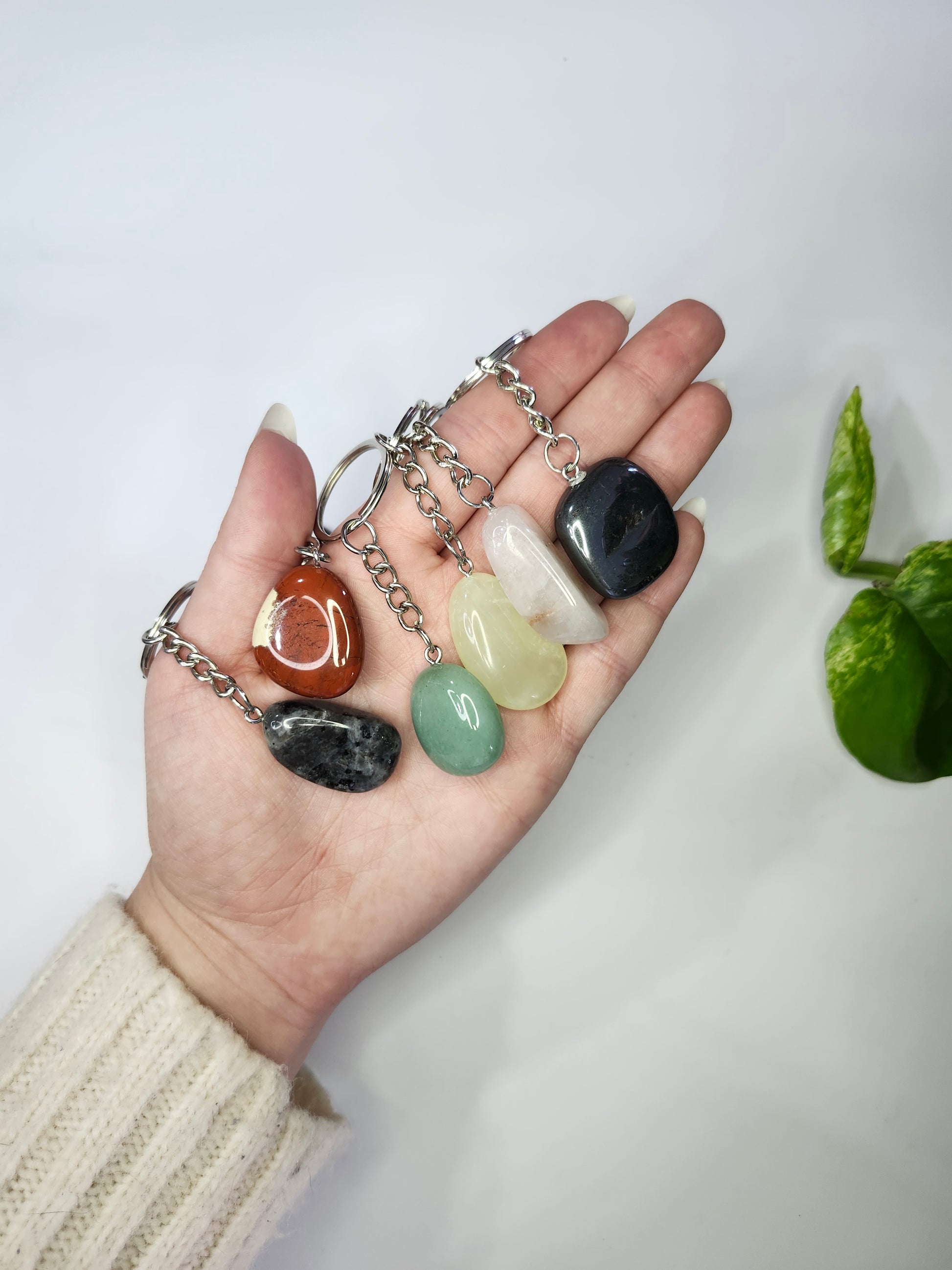 Tumbled stone keychain featuring assorted natural stones. Each keychain is unique, made with a variety of tumbled stones for a one-of-a-kind look. Size, color, and appearance may vary due to the natural uniqueness of the stones.